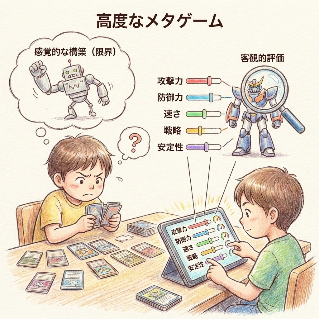なぜポケカの分析にAIが必要なのか。それは、単に「1枚の強いカード」を入れただけでは勝てず、「デッキ全体の構造的な強さ(安定性や妨害力など)」が求められるからです。