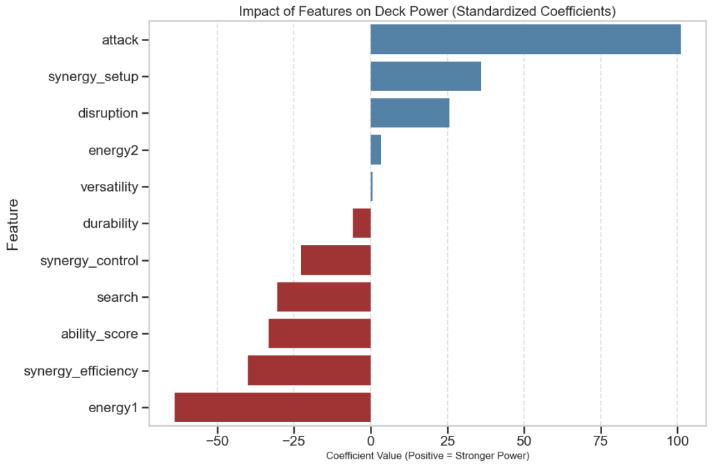 グラフを見ると、デッキパワーにプラスの寄与をしていたのは**「attack(攻撃力)」「synergy_setup(サーチ×特性の展開力)」「disruption(妨害)」でした。 一方で、赤いグラフの「energy1」は小さくした方が良い(マイナスの係数)**という結果に。やはり「少ないエネルギーで高火力を出し、サーチと特性で盤面を作り、相手を妨害する」というポケカの基本原理を、AIも正確に学習していることが分かります。