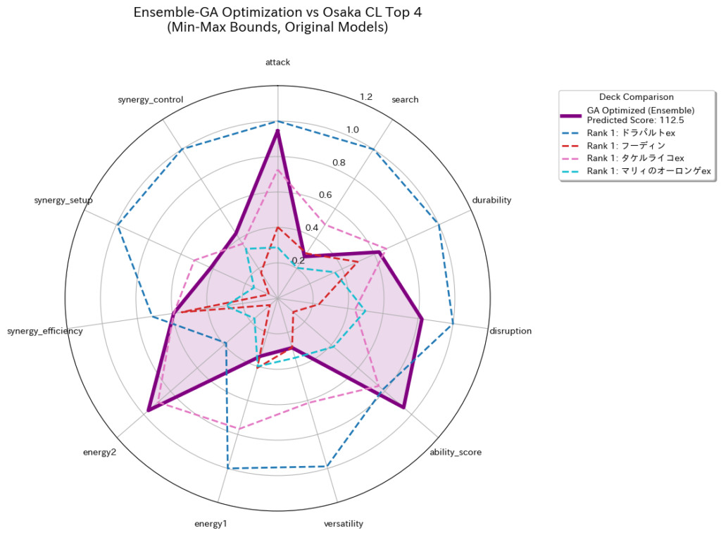 今回は、大阪CLの入賞デッキデータを読み込み、それぞれのデッキが「なぜ強いのか」を多次元的なパラメータで客観的に評価し、安定した勝率を叩き出す「黄金比」を見つけることを目的としました。