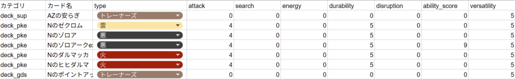 データ分析において一番の腕の見せどころは、いかに「ポケカのルールやセオリー」をAIが理解できる数値に落とし込むかです。今回は収集した大阪CL入賞デッキの各カード情報に対して、手動で以下の**基本ステータス(8項目)**を付与し、マスタデータを作成しました。